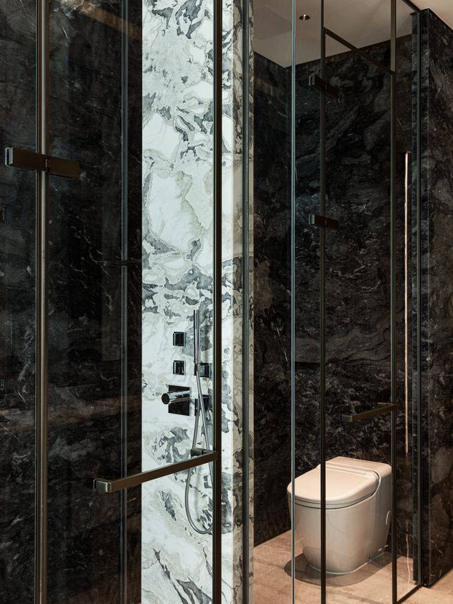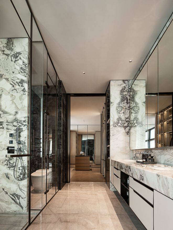 浴室的灰白纹理石材如水洗墨迹,含蓄而有表情,悬挑柜体让视觉厚度更显轻盈。通透玻璃分隔功能区,细致而有层次。窗边独立浴缸安放一隅,侧门隐秘,为生活保留余地。