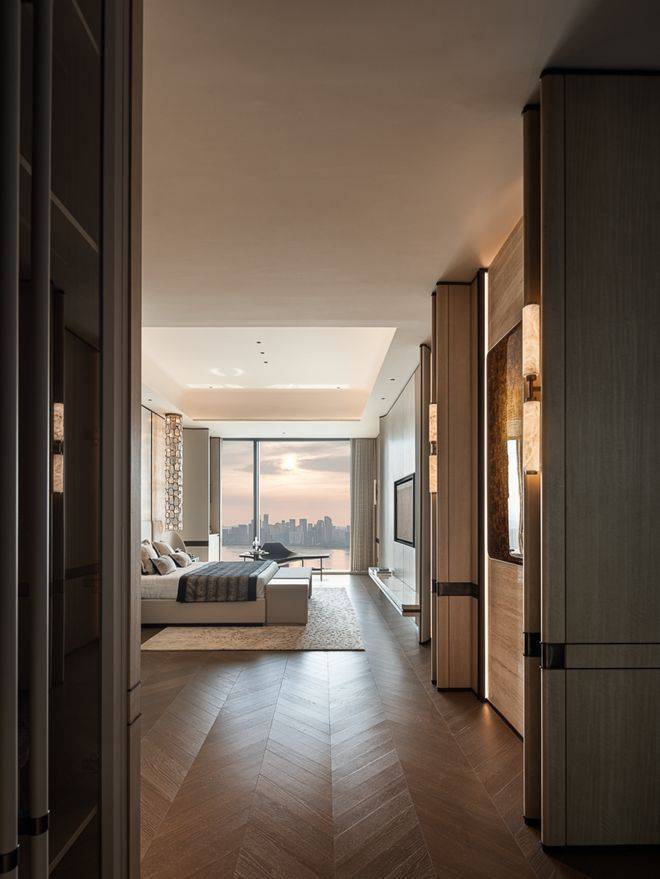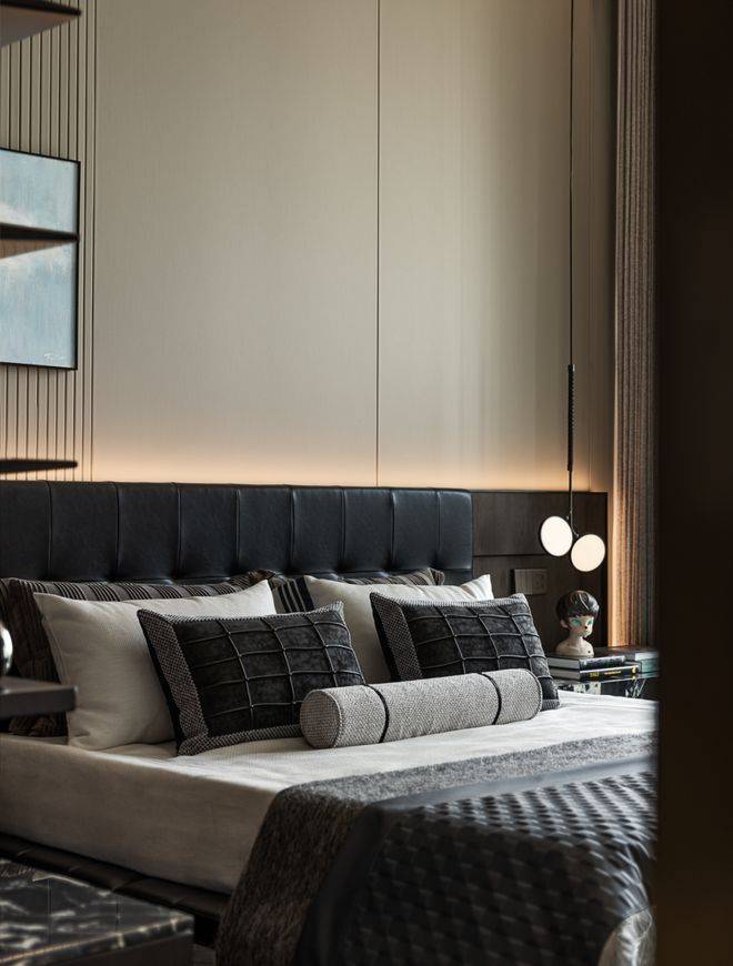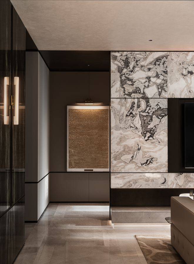 从过道走入私域,木饰面与暖灰石材交替铺展,灯壁与艺术作品点缀其上,像一段被压低声调的序曲,在主卧内,铺垫出细密的节奏。