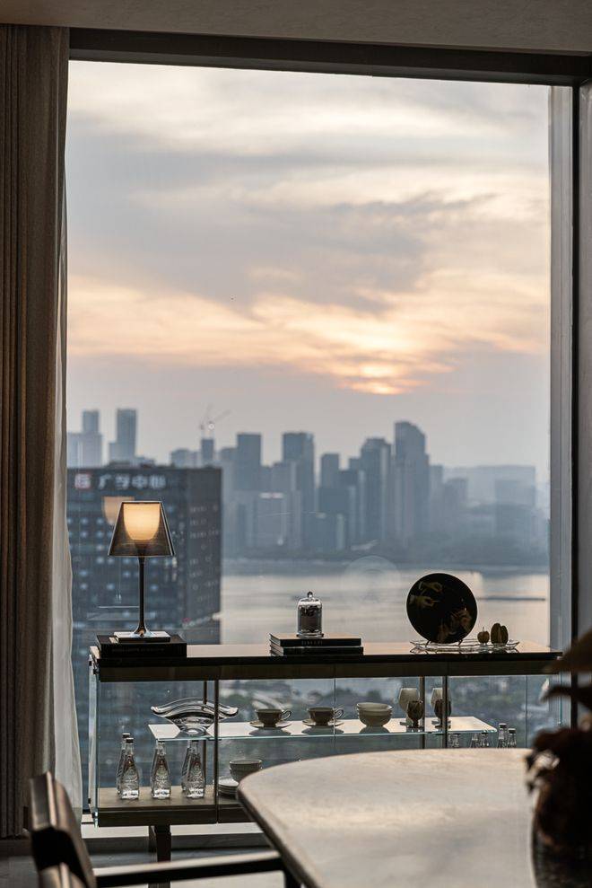 客餐厅作为核心中轴,形成一个多重功能的复合场域。落地窗将钱塘江的天际线引入室内,呈现出开合自如的呼吸感。