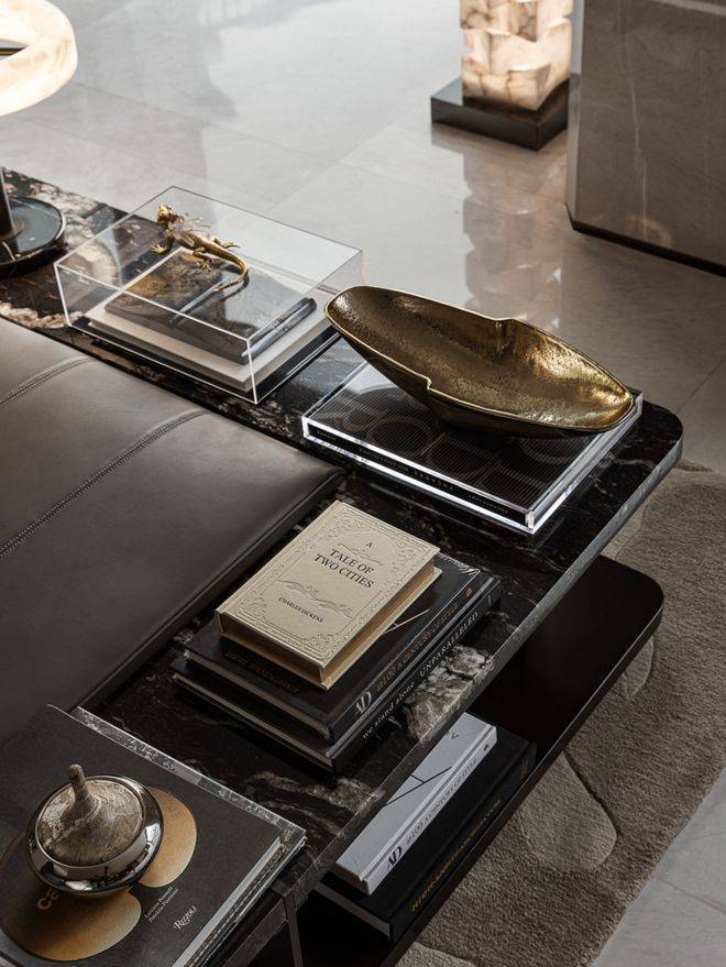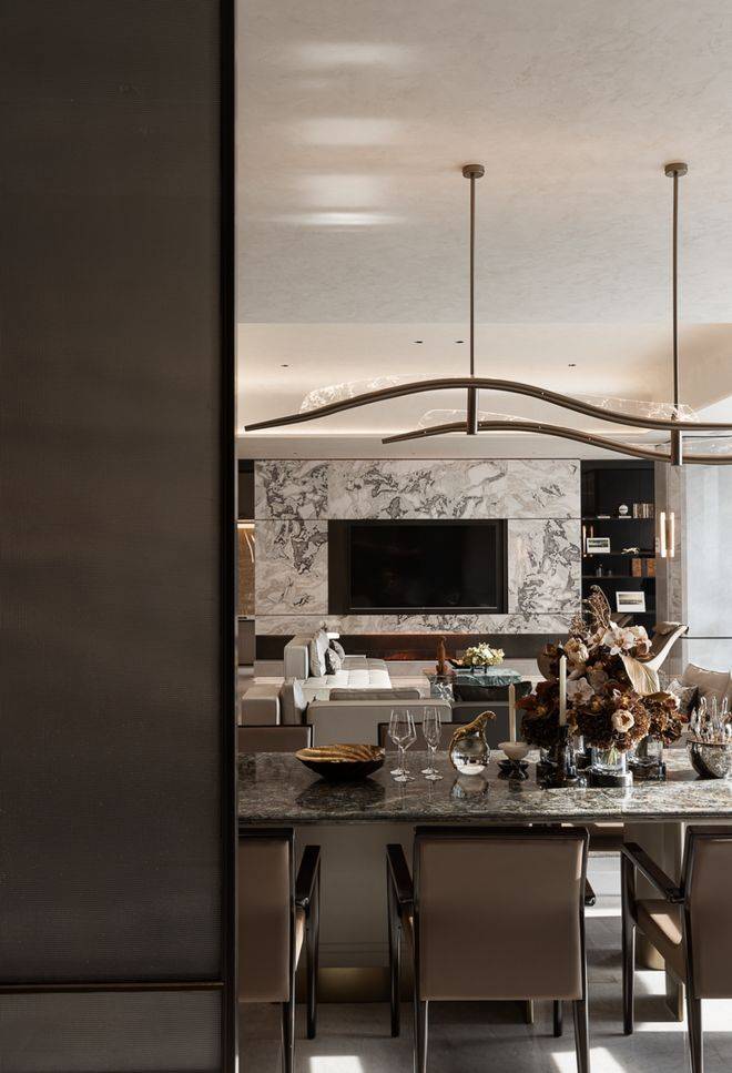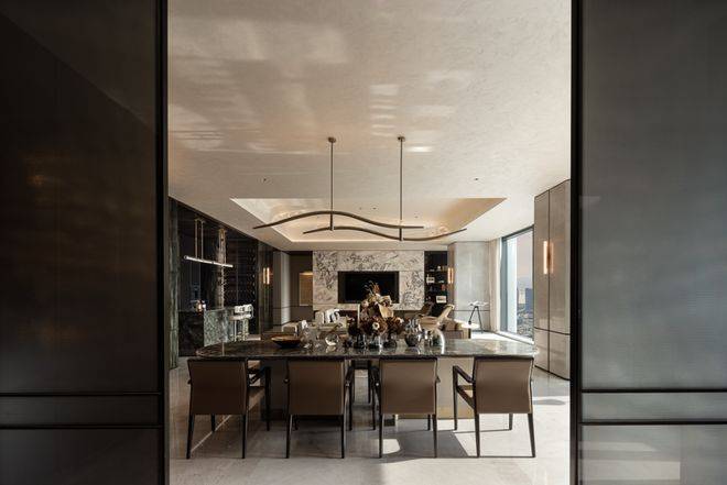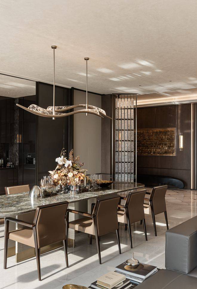 长桌石材深沉的纹理,在餐厅内映衬着波浪形吊灯,光影在金属与石面间流转。暮色下,餐椅围合出附有礼序的交流场域,光线沿着窗边柜体,映照出餐叙时刻的暖意。