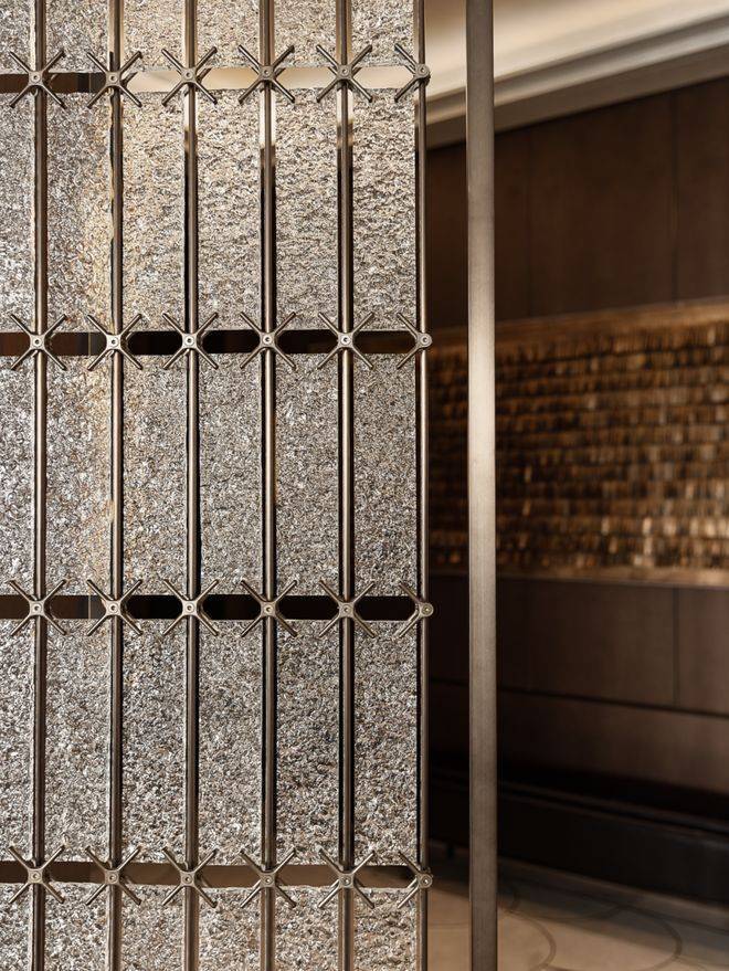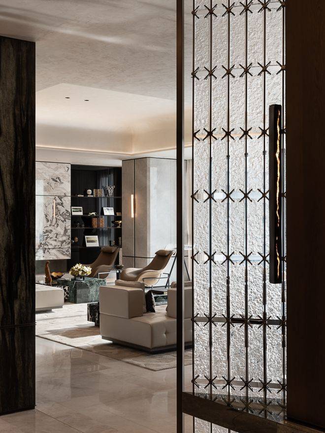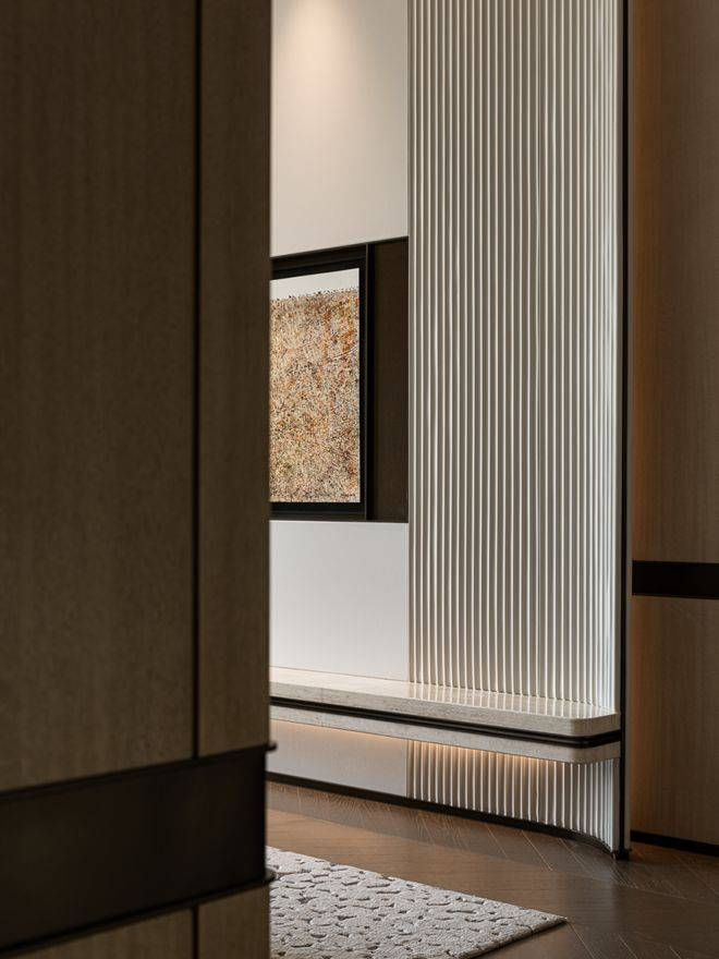 玄关是生活叙事中留下的第一口呼吸。深色木饰墙面与金属肌理装置并置,水纹般石材的走向轻轻引导视线。扇形弧线拼花地面,以金属嵌条细密收边,光在弧面与金属之间被柔和折返。肌理玻璃嵌入哑光金属格栅,在视线的渗透与阻隔之间形成微妙平衡。