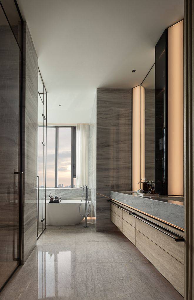 窗前软榻与小圆几相对,白日临景阅读,夜里小酌沉思。通顶玻璃柜与开放架围合衣帽间,灯带隐入背板,踢脚回光映托陈列。石材通铺的浴室尽头,独立浴缸正对景窗,功能隐入背景,留下整洁与缓和。