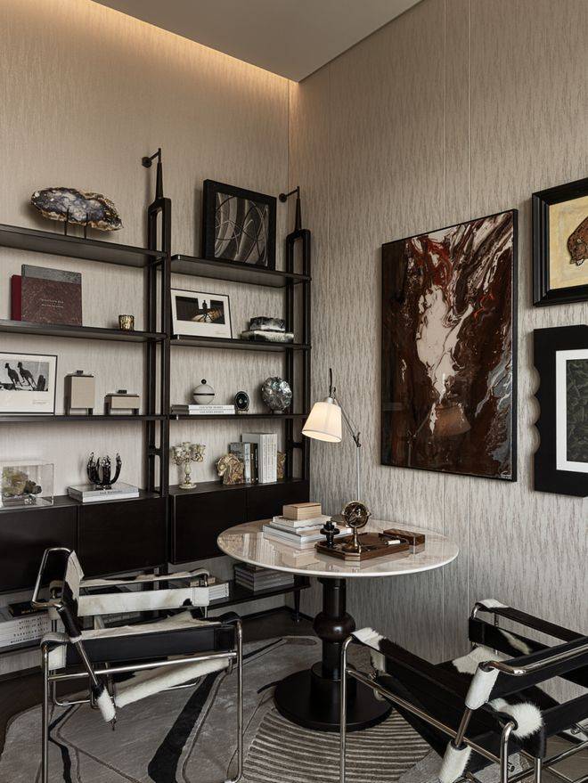 书房隐于远离动线的一隅,浅米色肌理墙在光影中泛着细腻质感,与深色木质书架相映成趣。圆形石桌为静谧的中心,两把皮与金属结合的座椅围合出沉静气场。阅读、写作与思考皆可自然发生。
