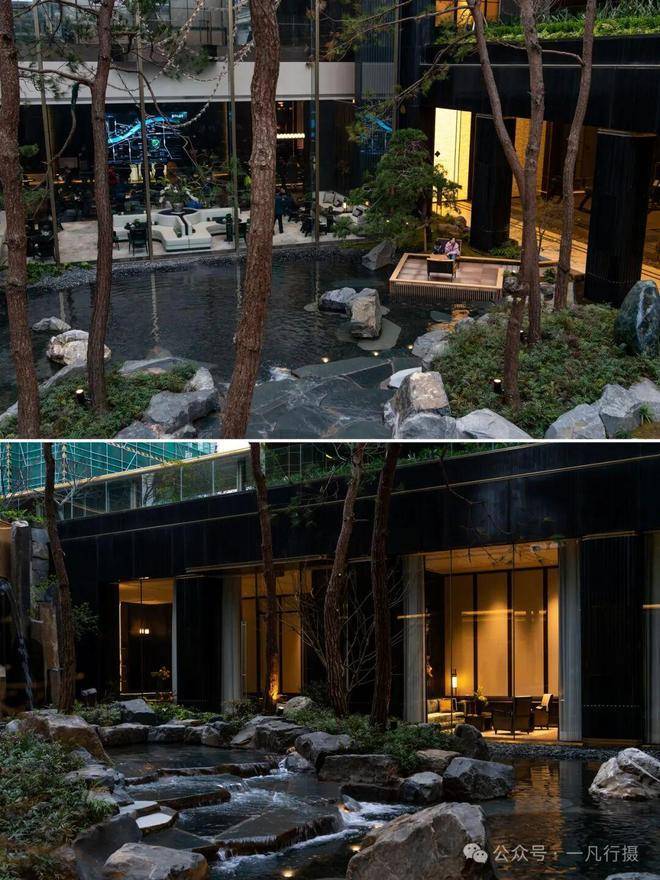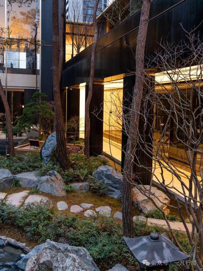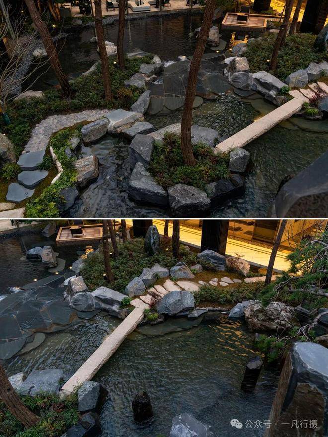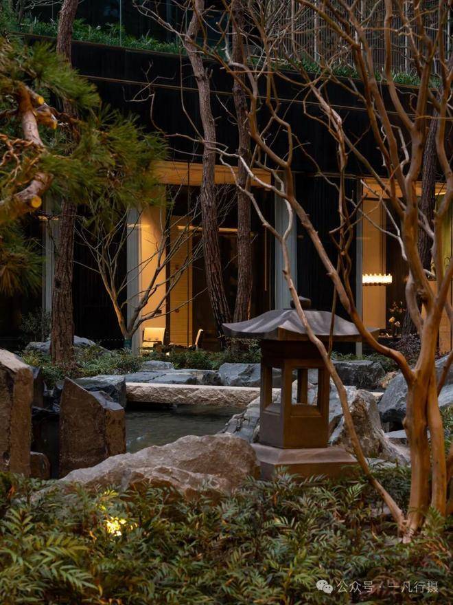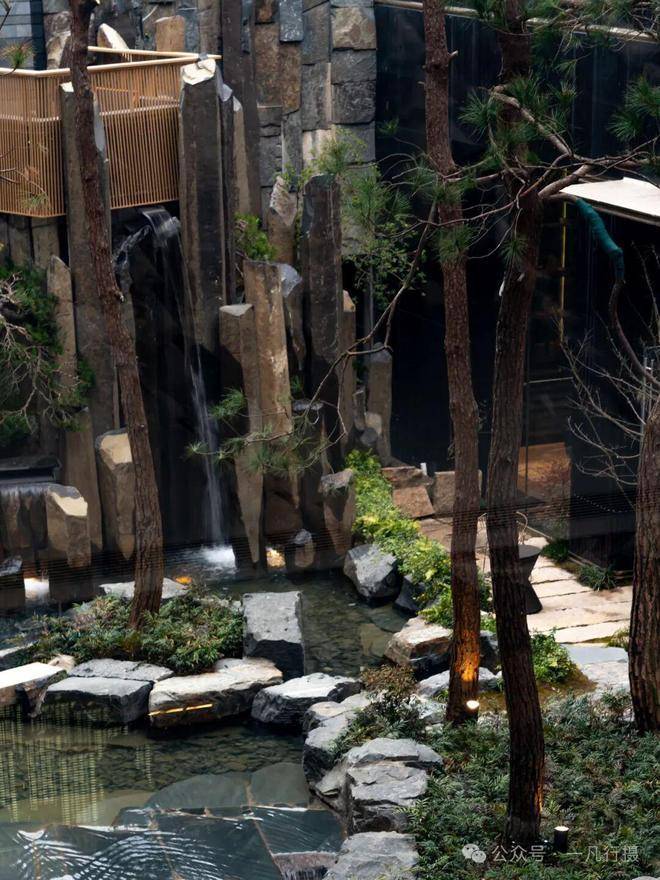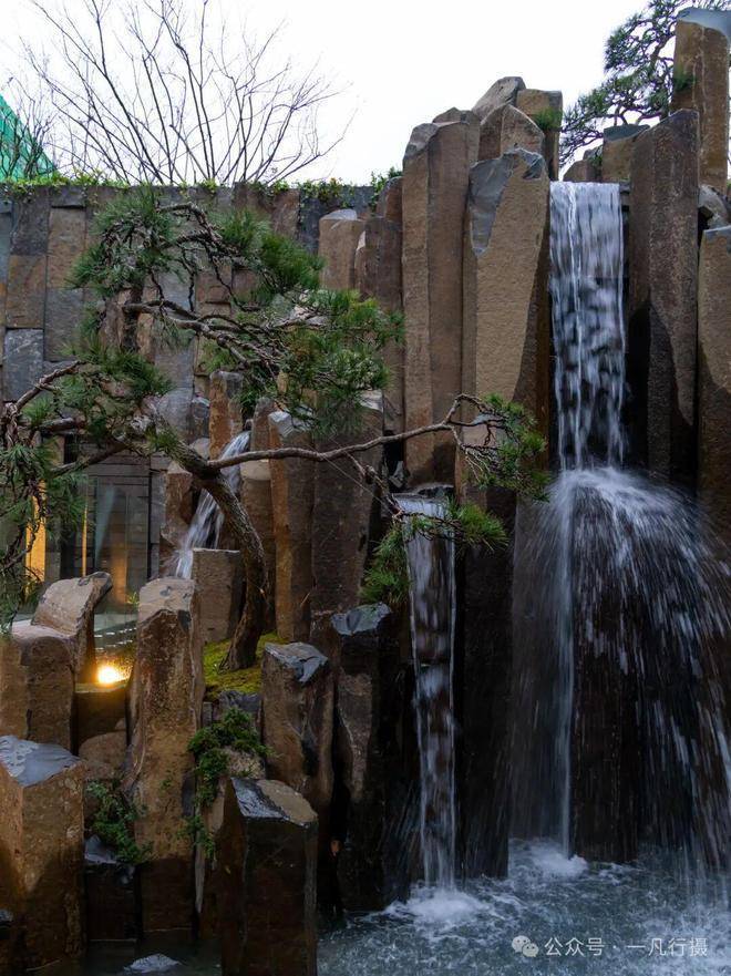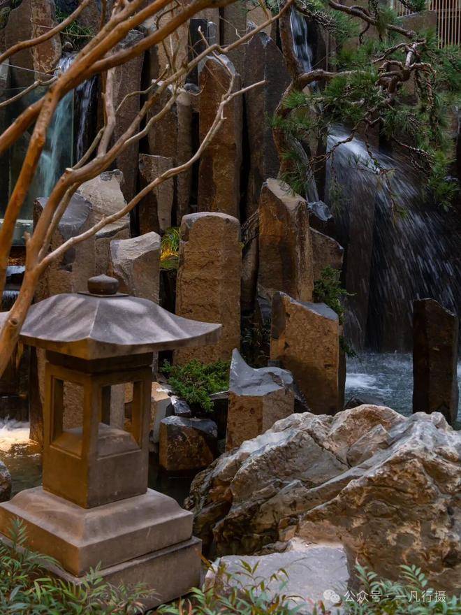 进入庭院,犹如进入了一个空山幽谷的世界,来自火山遗迹的六方石,形似拙朴的天然崖壁,瀑布冲刷石块的水流声,整个庭院显得尤为幽静,步履相随间掀开隐与奢的生活序幕。