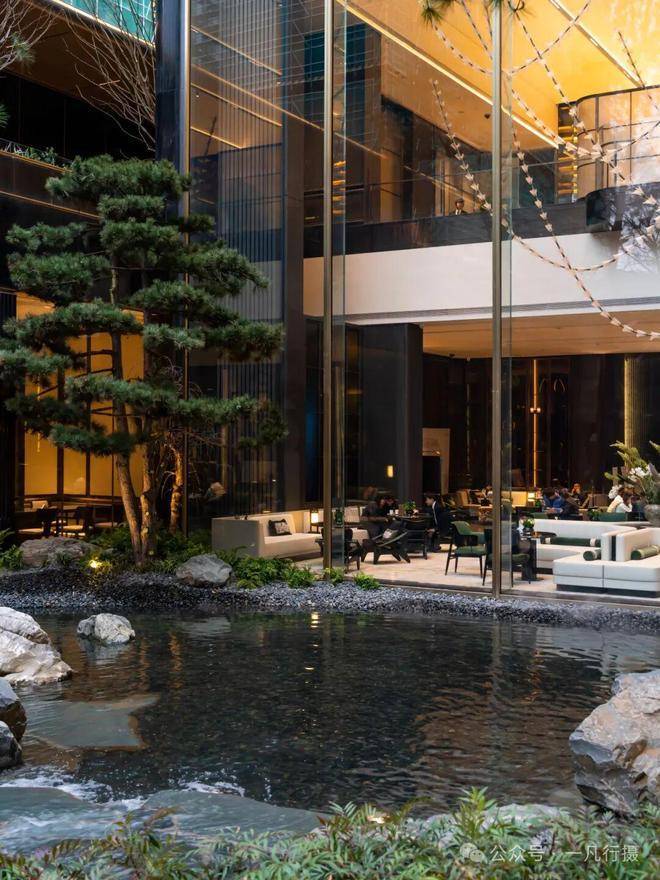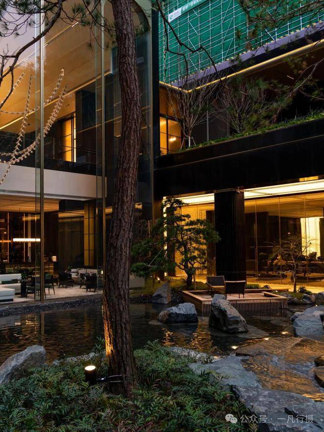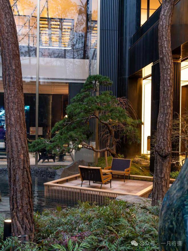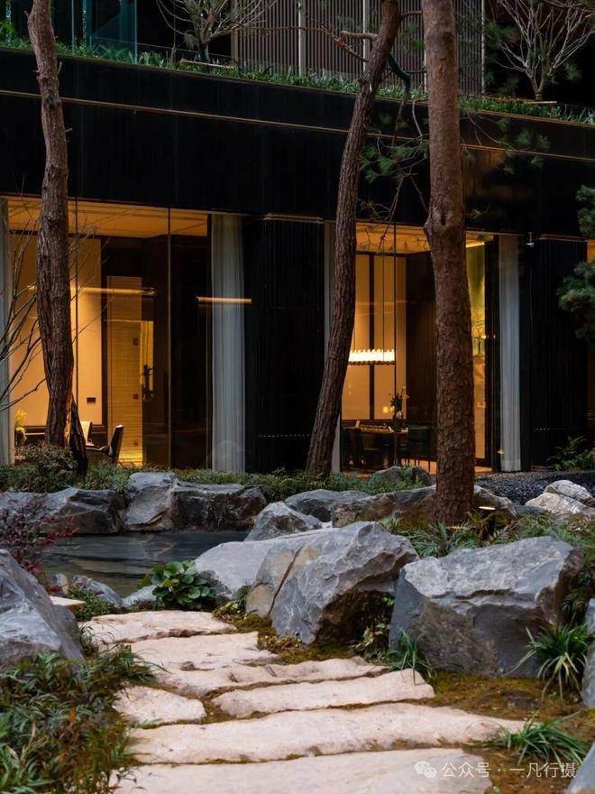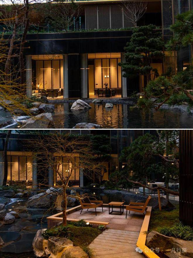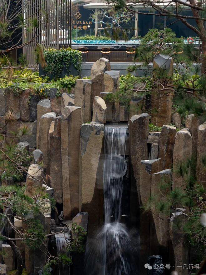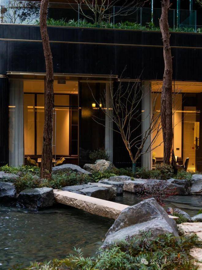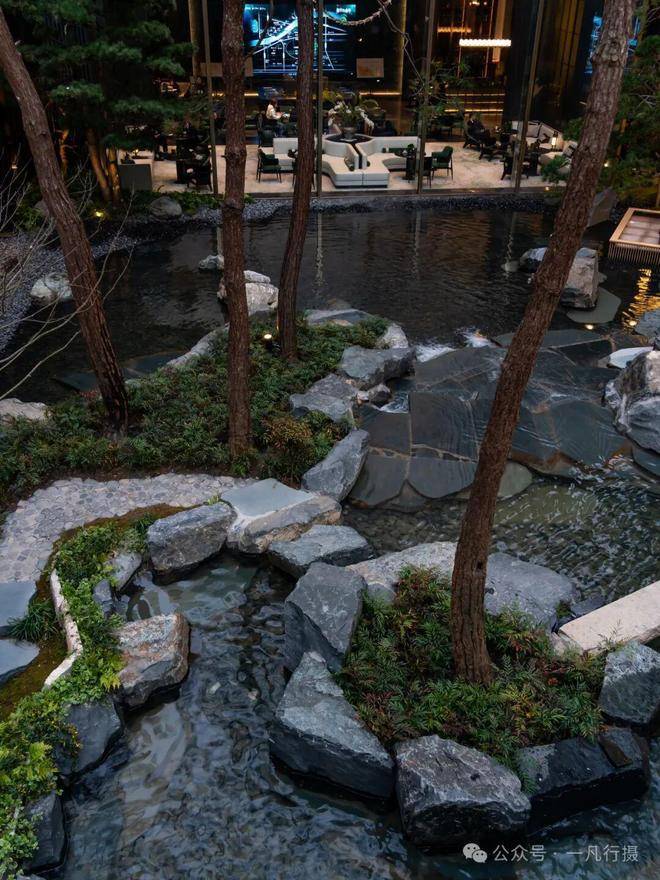进入庭院,犹如进入了一个空山幽谷的世界,来自火山遗迹的六方石,形似拙朴的天然崖壁,瀑布冲刷石块的水流声,整个庭院显得尤为幽静,步履相随间掀开隐与奢的生活序幕。