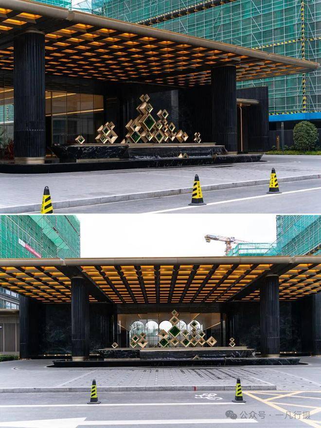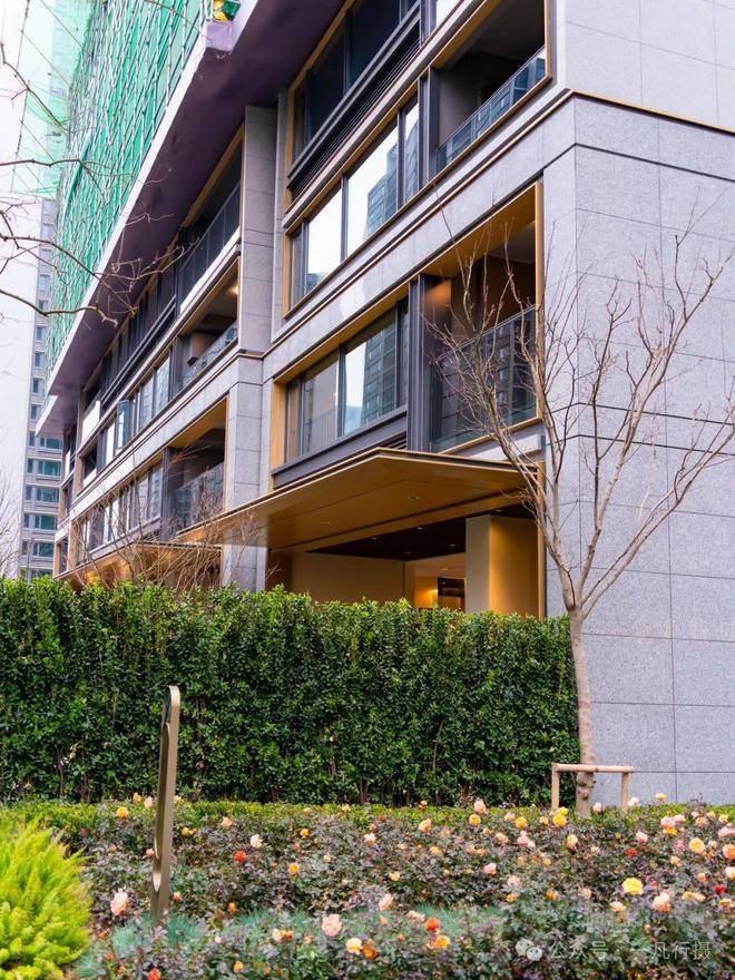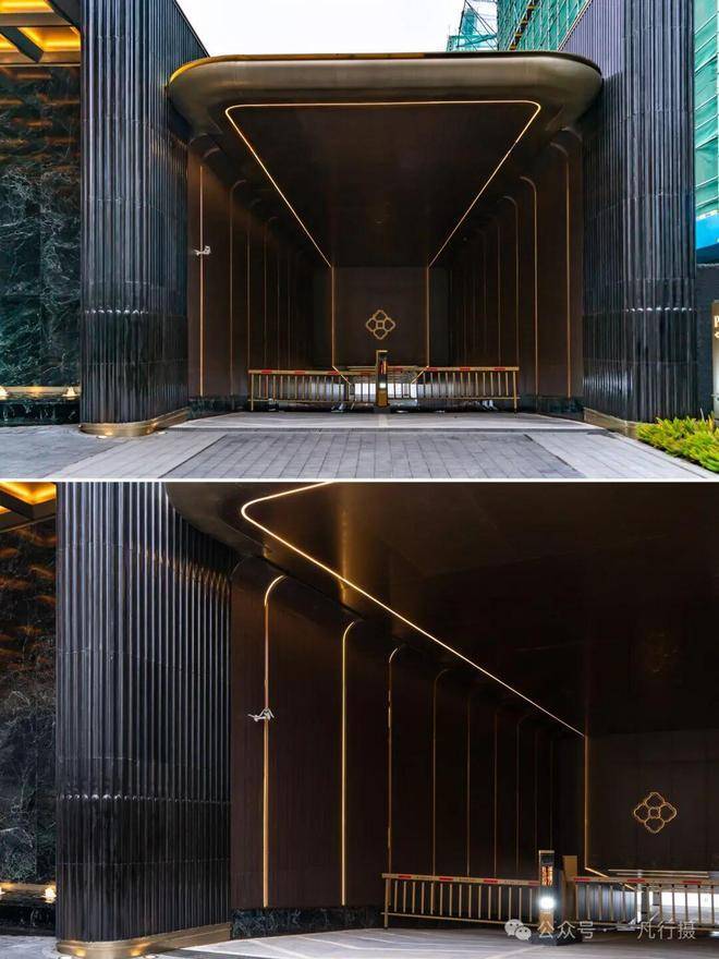 建筑立面色调为灰+金色系,以金色套窗框的设计手法,强化整个建筑立面视觉效果,呈现出一种低调奢华的氛围。可惜的是,建筑立面没有用四面铝板。