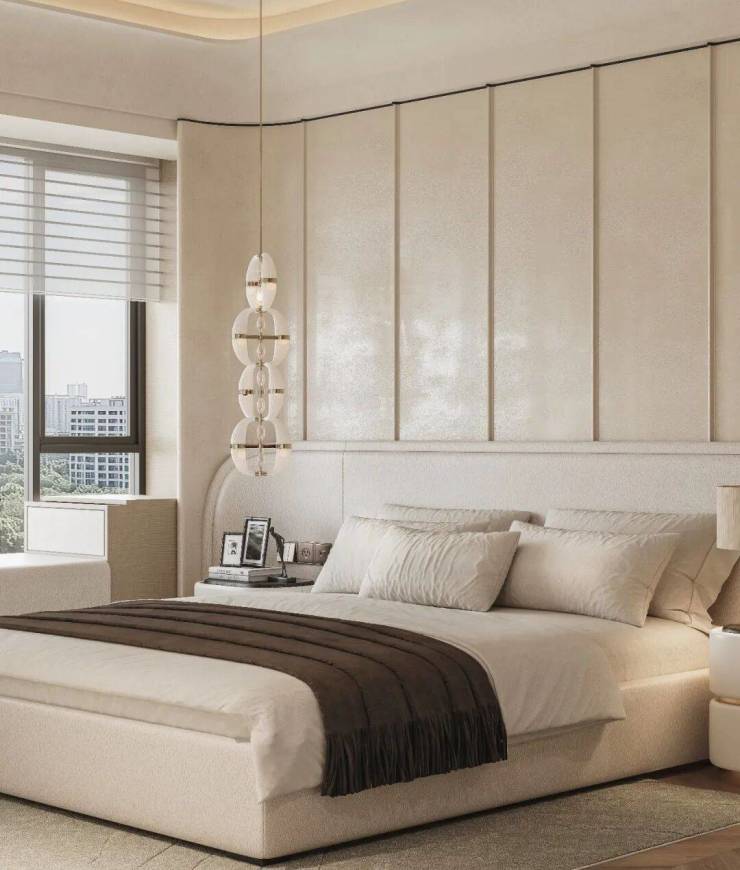收纳上采用整面隐形通顶衣柜搭配内嵌开放壁龛,极简整洁且储物充足;软装精简克制,圆润家具与艺术陈设错落排布,兼顾睡眠、休闲等多重功能,同时衔接户外窗景视野,在私密空间里,打造出兼具高级质感与治愈温度的休憩居所。