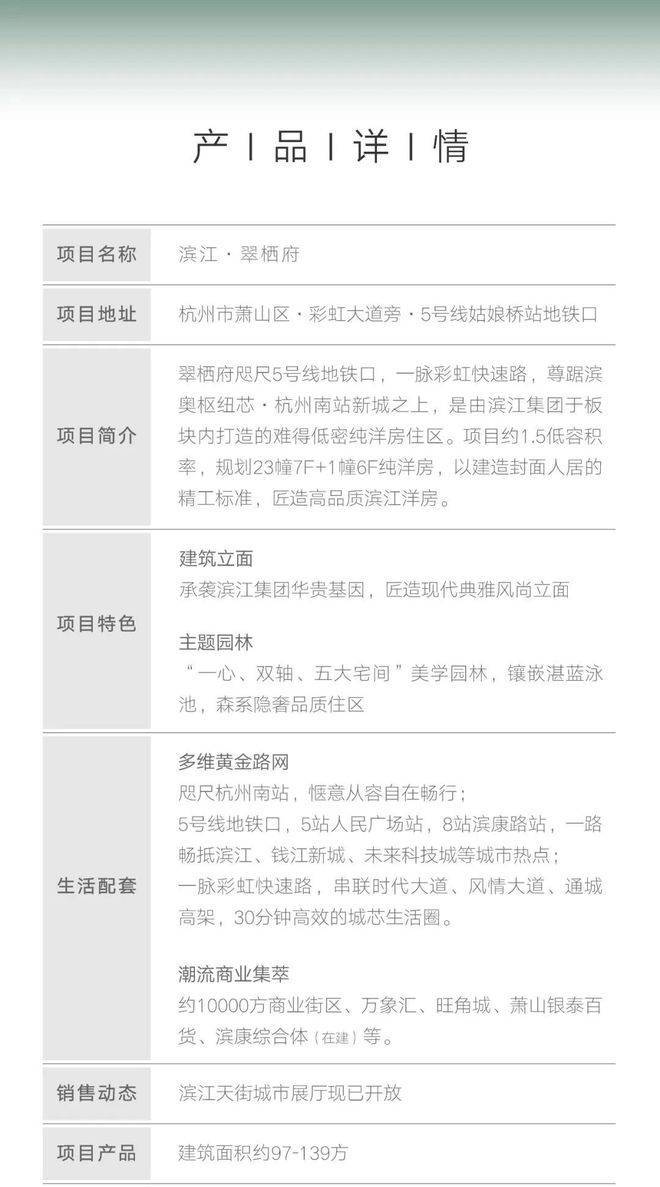 滨奥栖心处,翠色见杭州!在杭州,洋房几乎成为这座城市优雅的生活代言。滨江集团深谙杭州骨子里的优雅与美,于此打造板块内难得低密纯洋房住区,将城市的自然之翠、建筑的品质之翠、生活的丰盈之翠,融汇于“翠栖府”,让城市与人居理想共鸣。