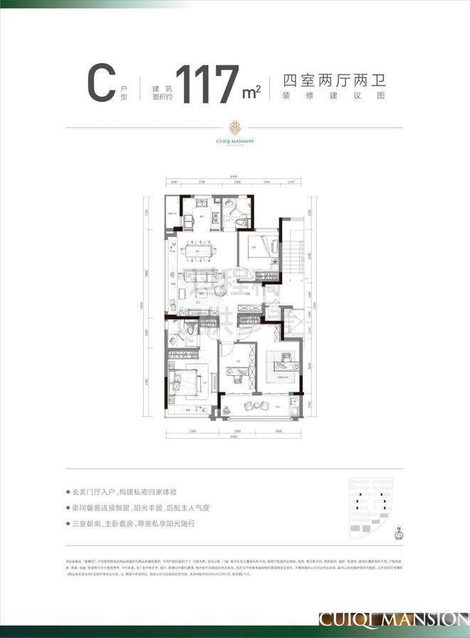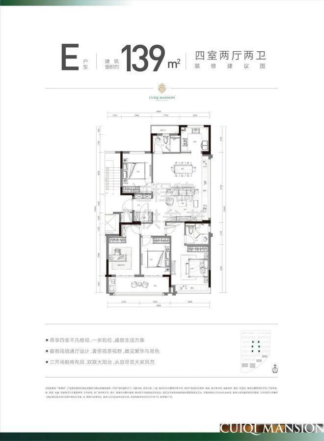 户型:主推建面约97-139㎡户型,其中97㎡为三房两卫三开间朝南,139㎡为四房两厅双阳台设计,餐客厅开间达6.7米,全屋精装交付(含地暖、中央空调、老板电器等)。