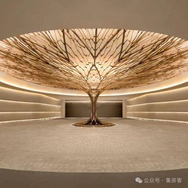 因项目整体抬高,从下沉庭院到架空层“空中花园”的落差极大,形成独特的峡谷地貌,杭序府的设计团队汲取九溪烟树为造园灵感,打造一个立体多维的城市溪谷交互园林;因项目毗邻江岸,杭序府的外立面以“站立的江潮”为灵感,