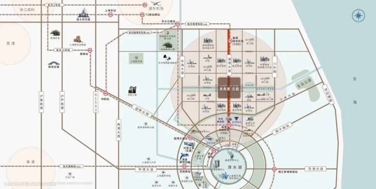 项目位于临港105片区,距离16号线滴水湖站约3.2公里,16号线可与2、7、9、11、13号线实现换乘;