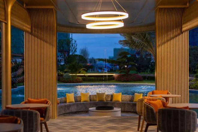 整个户外会客厅处于景观中轴之上,从池边向中央“生长”,靠近中央的位置还特地做了一个下沉空间,在蔚蓝的水池间涌动出度假的松弛感。