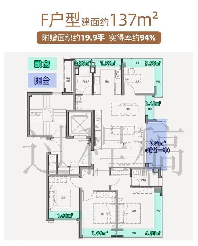 全屋7飘窗+半封阳台,赠送面积近20㎡,实得率约94%。