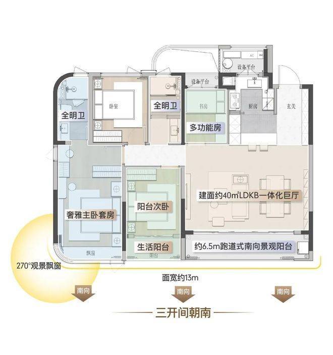 南向约13米奢尺开间,约9.5米超大面宽双阳台,PLUS级宽阔格局,舒享气派人生。