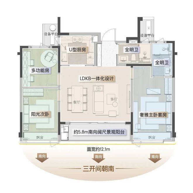 三开间朝南面宽达约12.1米,搭配约5.8米南向封包阳台,采光一流,伺花弄草、阅读品茶等生活的多重场景都可以实现。