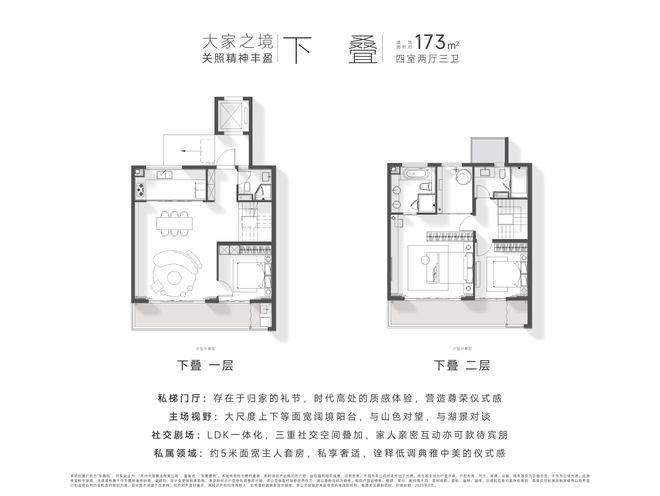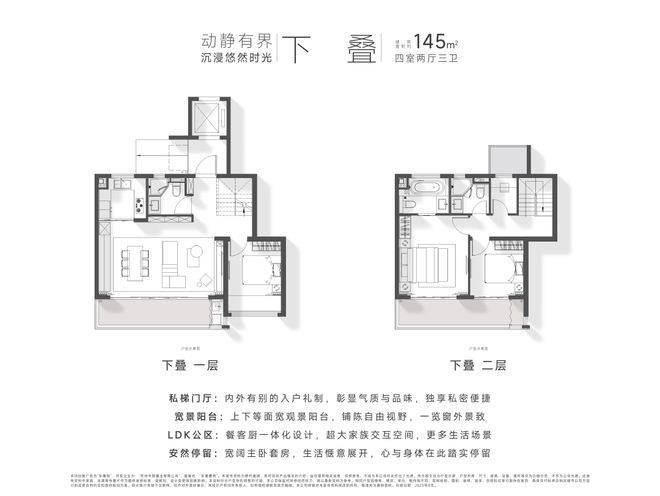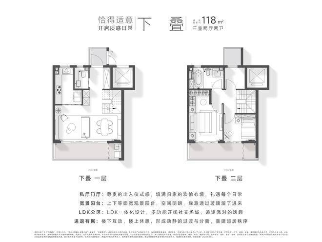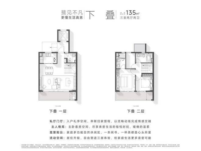 定制空间:全横厅设计、LDK多功能家庭区;功能间配置+灵动空间设置;建面约135㎡以上户型,全3卫配置,居住品质更高。