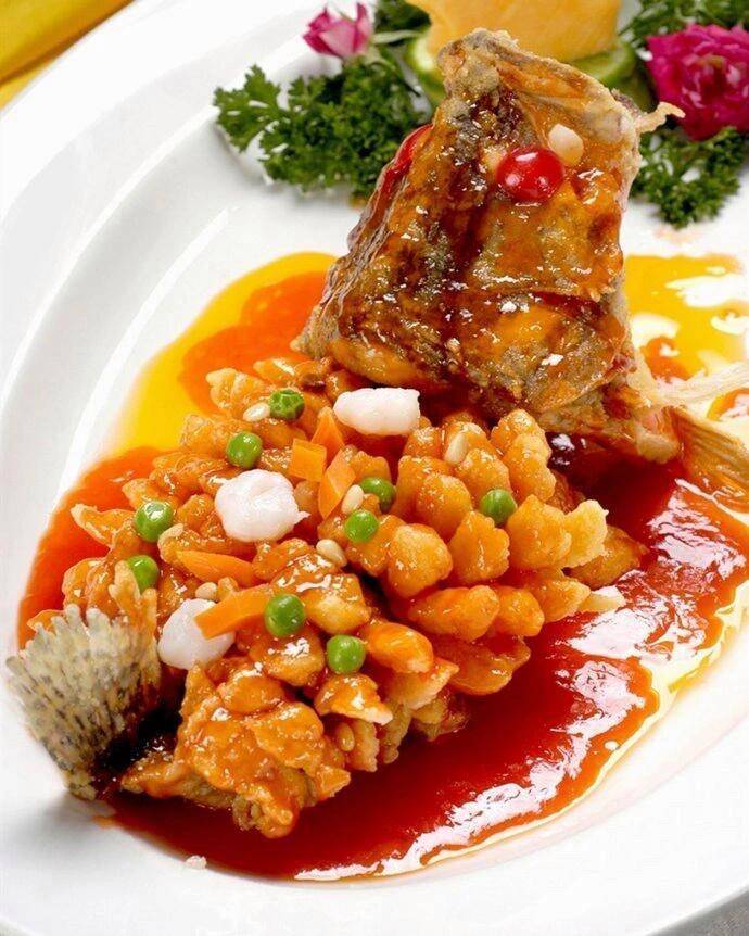 这道菜虽常出现在宴席上,但在苏州街头的老字号里也能吃到家常版本。新鲜的桂鱼去骨后改刀,油炸后鱼肉翻卷如松鼠尾巴,浇上酸甜的番茄酱汁,外酥里嫩。
