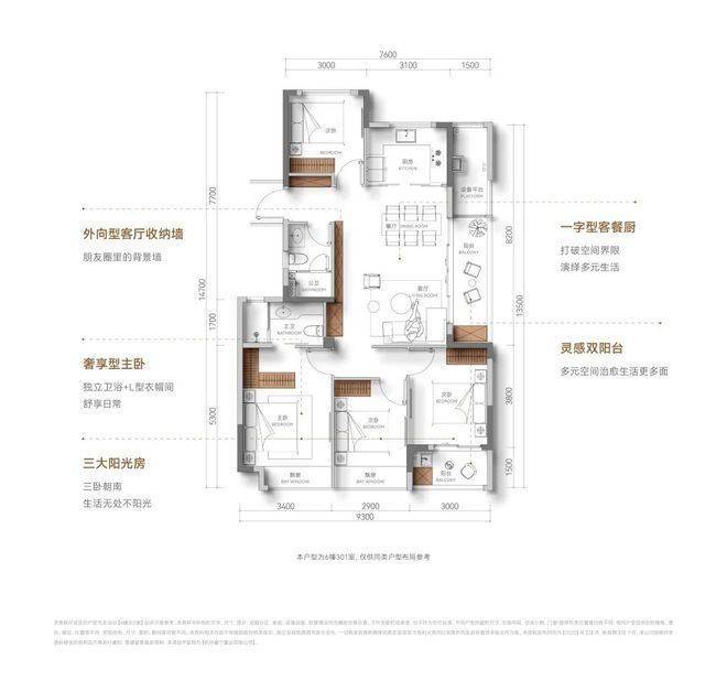 110㎡:边套大三房,6.3米跑道式双联阳台,餐客厅约29㎡;