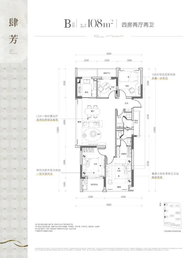 此宽境四房,既满足居住功能性,又有舒适的居住空间。三卧室+客厅,四开间朝南,享受约13.5米阔绰大面宽;灵活可变3+1房,契合三代同堂居住需求;U型厨房动线顺畅,一体化双厅,足以让家人欢聚一堂;小家化主卧套房,舒适感触手可及。