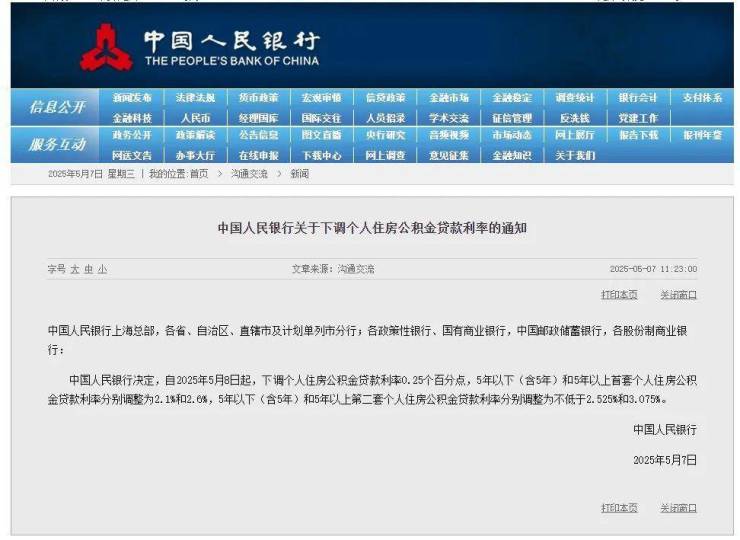 中国人民银行决定:自2025年5月8日起,下调个人住房公积金贷款利率0.25个百分点,5年以下(含5年)和5年以上首套个人住房公积金贷款利率分别调整为2.1%和2.6%,5年以下(含5年)和5年以上第二套个人住房公积金贷款利率分别调整为不低于2.525%和3.075%。