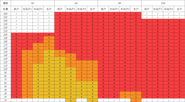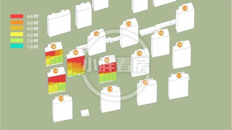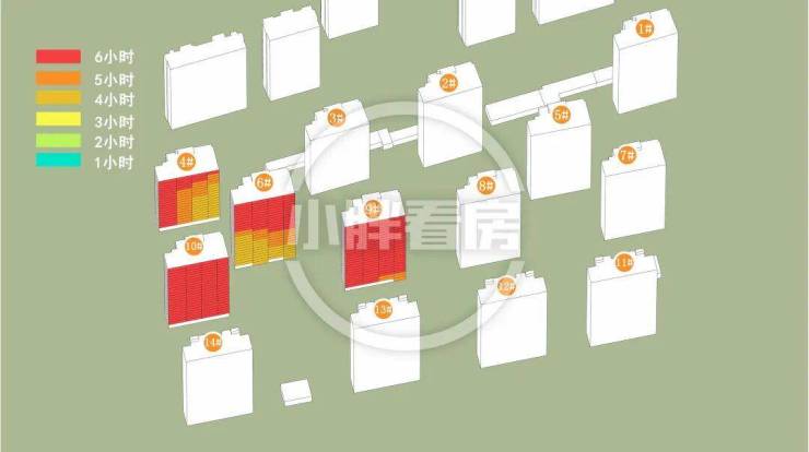 10#采光优异几乎不存在遮挡。4#6#中低层受遮挡。9#低层受遮挡。就具体遮挡时间而言,4#主要在上午受6#遮挡。6#主要在上午和下午受9#10#遮挡。9#主要在上午受12#遮挡。