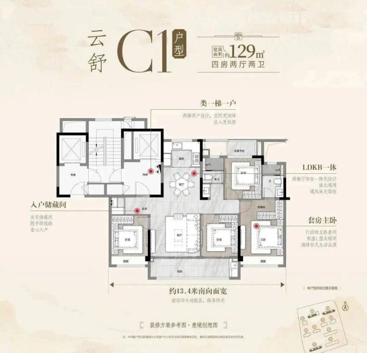 2、四开间朝南,南北通透(南向面宽13.4米)