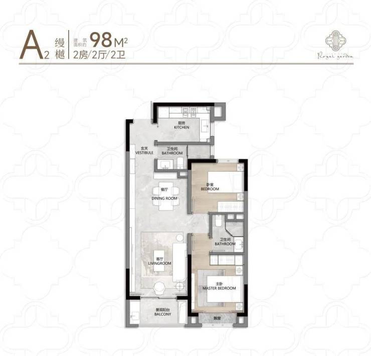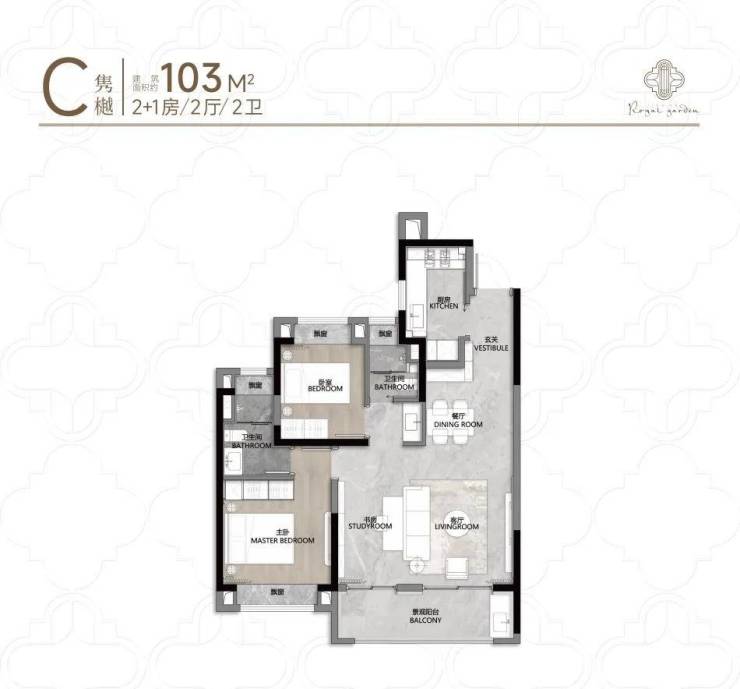 户型得房率75-79%(高于市面74%),建面约98-104㎡三房实现“小面积多功能”(如270°阳台、双套房设计);