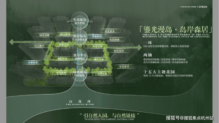 整个社区内,项目规划“一环两轴十五园”景观布局,将水岸、岛屿、森林、花园、树屋作为园林节点,营造出沉浸式山水活力场域。