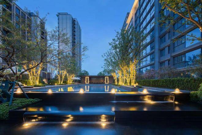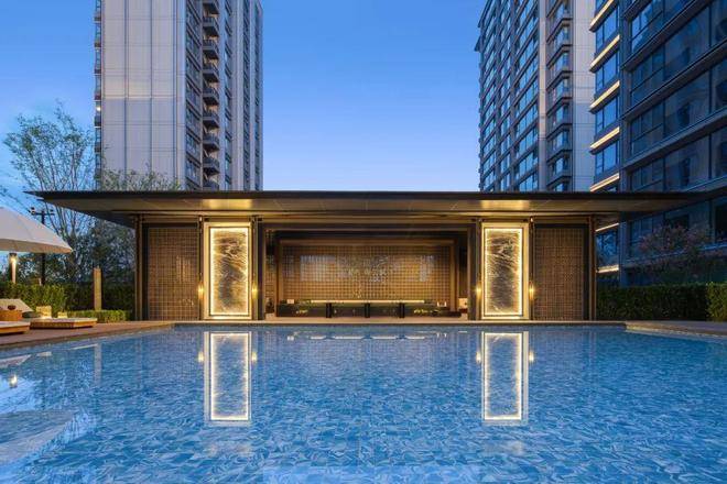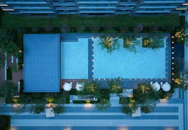 所以,当孩子们在嬉水池踩水、欢闹,你可以在泳池边舒展的枝丫下,在一个舒服的躺椅上休憩、闲聊,这样一来,湛蓝的嬉水池就成了密友聊天和亲子共聚的背景。
