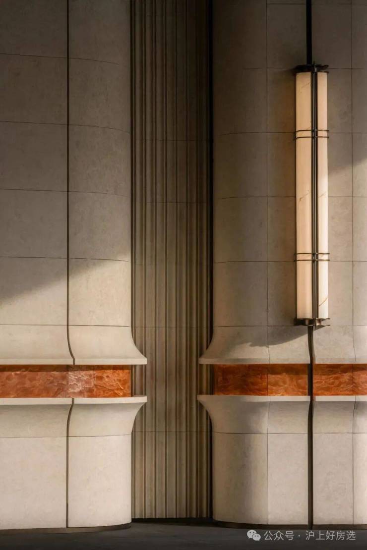 此外,招商序还藉由“吴淞灯塔”及其形制,原创落客雕塑“源流”,定制的云石玻璃、保加利亚进口的沉香米黄石材的底座,搭配以安哥拉黑大理石,营造温润的归家昭示。整个前庭形成艺术感与实用性兼具的环岛式落客区,进一步提升仪式感。