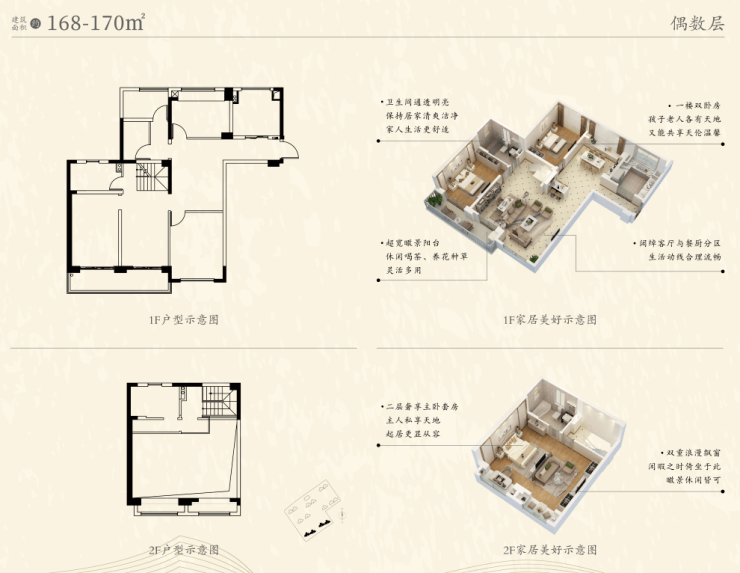 建面约168-170㎡升级新品,双层设计,灵动复式空间,动静分离;客餐厅一体,整合空间更显宽阔;主卧超大套房设计,悦享奢适质感生活;超宽观景阳台,揽瞰一线江景与城市风光。