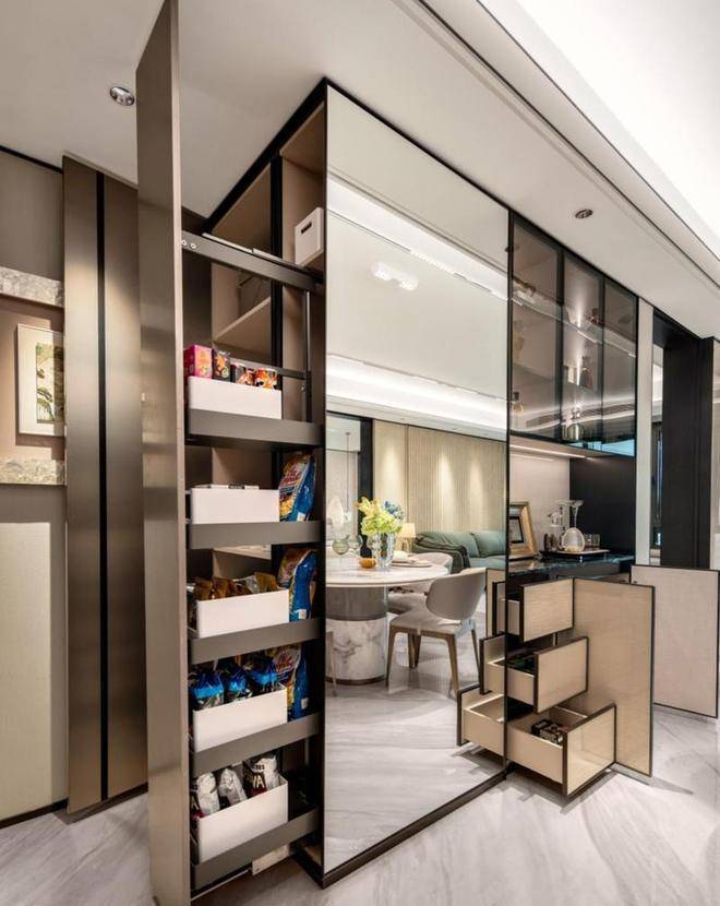 双边收纳矩阵,大件小件皆可存放,满足家庭不同的收纳需求;客厅一侧通顶高柜设计,高尔夫球杆、羽毛球球拍、鱼竿等多尺寸大件轻松容纳,累计可收纳200双鞋子;餐厅一侧的多功能餐边柜,集吧台、展示柜、收纳柜三合一功能为一体,同时,侧面也配备侧拉零食柜、储物柜,进一步提升家庭精细化收纳,饮料、酒水、零食、行李箱等可轻松规整,精细化分区,让家井井有条。