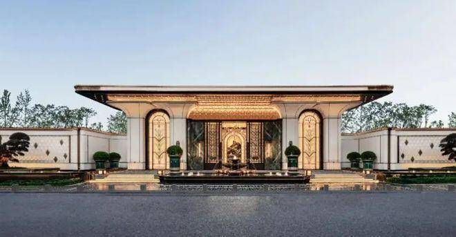 设计美学:融合新中式建筑元素,采用浅灰铝板+香槟金线脚立面
