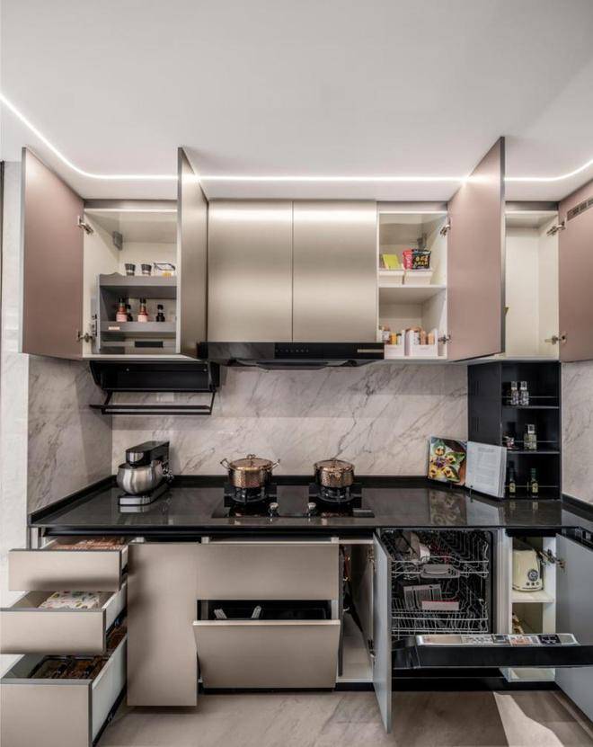 建发海宸巧妙利用空间拓展、功能分配、动线设置、超能收纳等实现了好厨房的“1步法则”,将操作步骤调配到舒适距离,让男女主人爱上下厨。