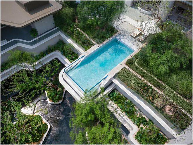 灵感源自新加坡edtion度假酒店的悬挑式戏水池,搭配4.3米飞瀑,创造别具一格的城市绿意的立体浮岛视觉奇观。