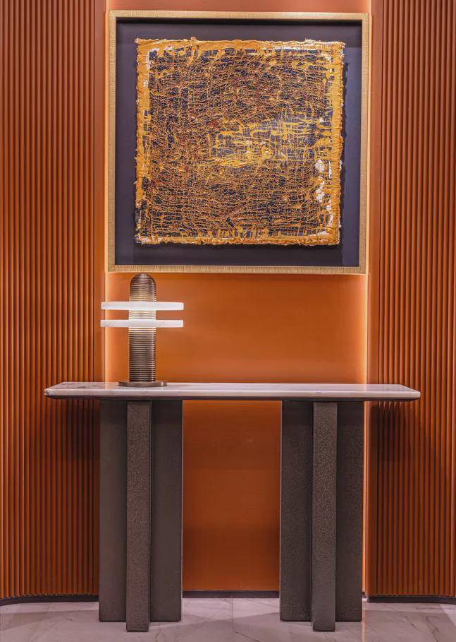 比如书厅空间,选用了当代大漆艺术家段一凡以石库门老建筑红砖墙元素为灵感的作品《Stroke--Gold above red》,让空间集萃了露香园传奇元素与海派底蕴。