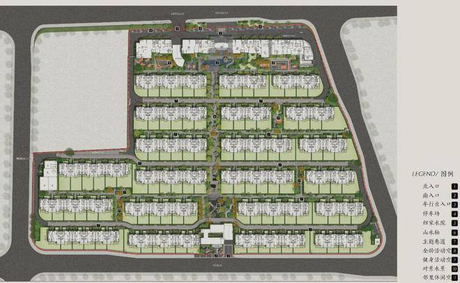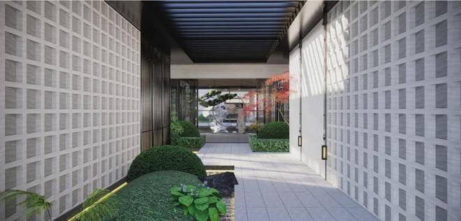 在园区规划和品质提升方面,注重高端社区的隐奢感和礼仪感,营造大宅的空间序列格局。空间轴线是建筑层次构建与韵律感的重要组成部分,本案在局促的场地条件下,通过合理高效的内部功能组织,采用多种虚实体块穿插和组合的方式,塑造贯穿南北的一条180余米主轴线。