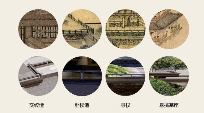 对于宋式绘画及营造法式进行研究与分析,提取宋式建筑木白互显,出挑深远,强调横向线条的伸展性特征,用于本项目的立面造型处理中,通过连续的水平杆件及构造做法,横向分层,展示建筑的纤细轻盈及线条感,同时将装饰与结构构件进行一体化的结合,实现精巧却不繁复的建筑形式。