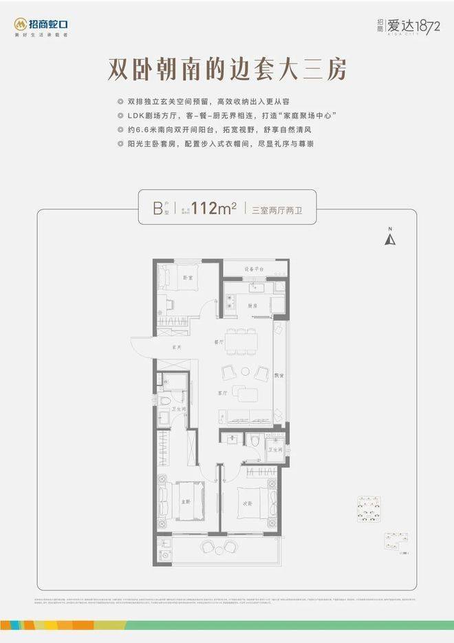 与常见的中间套户型不同,招商爱达1872的约106㎡,南向有3.5开间,面宽约有11.7米。如此一来,可以将更多南向开间面,留给餐客厅,同时外接约5.6米长的南阳台,让公区显得更为阔绰。
