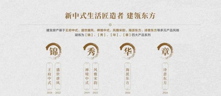 建发房产基于王府中式、盛世唐风、禅境中式、风雅宋韵、海派东方、诗意东方等多元产品风格,凝练为【锦】、【秀】、【华】、【章】四大产品系列。