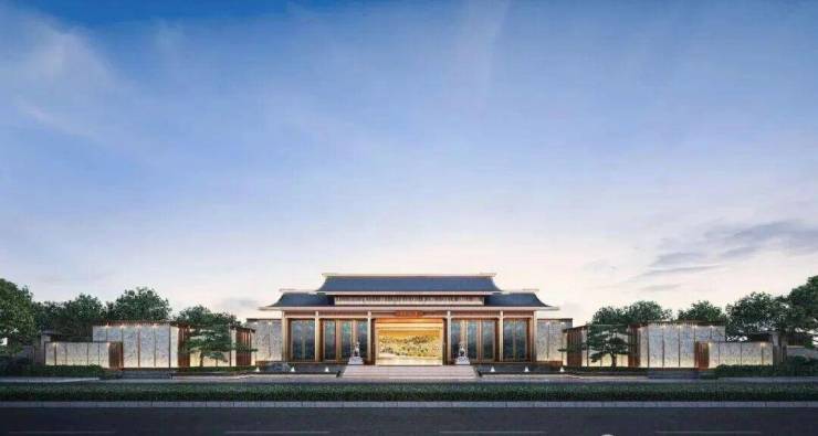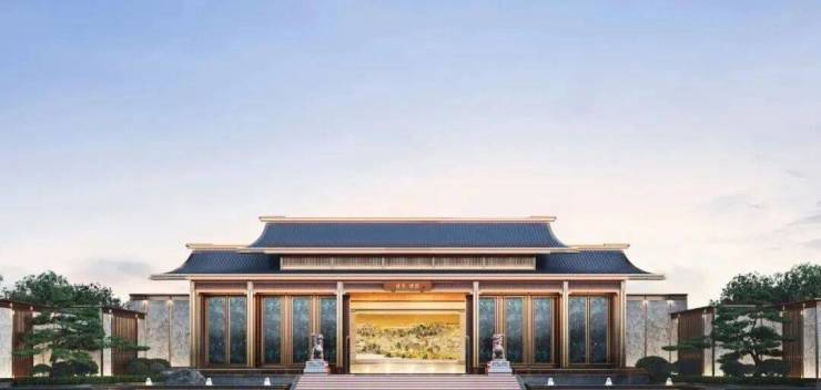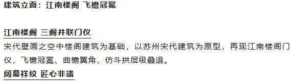 立面形制以借鉴宋皇室《仙山楼阁图》《瑞鹤图》中建筑要素为灵感,并以沧浪亭中明道堂为基础。采用重檐坡屋顶,五间一启形制,庄重不失克制。七阶入门,象征尊贵寓意圆满。门楣大师墨宝,门内非遗漆画姑苏繁华图,再现金阊的富贵之景