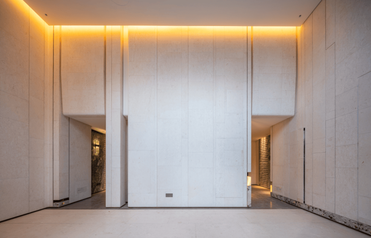 你能看到,洋房约5.3米高的大堂,归家每一步都是尊贵感;甚至电梯轿厢墙面都采用瑞士翡翠奢石,既有玉石的温润感,又不张扬。