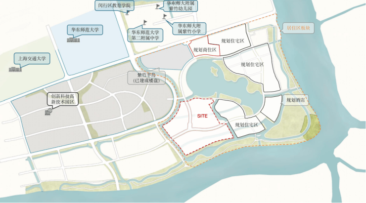To the west of the project is the Zizhu High-tech Industrial Park, and to the north are the campuses of Jiaotong University and East China Normal University, as well as the Zizhu Basic Education Park, which includes educational facilities for all ages from kindergarten to high school.