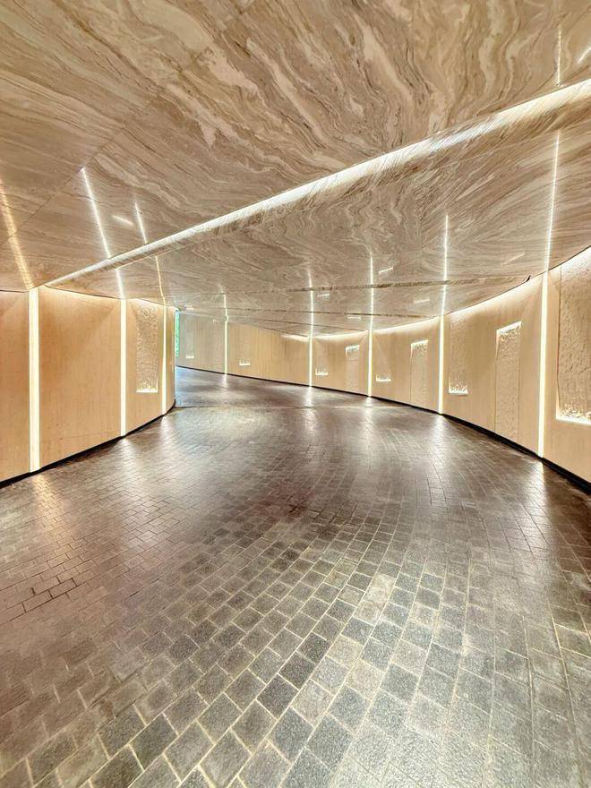 采用米黄色温润石材,巧妙模拟风的流畅形态,营造出既庄重又舒适的归家氛围。这片宽广的流线型石墙在柔和灯光的映衬下,更显璀璨夺目,而风雨连廊的灯带设计,更添一份尊贵仪式感。