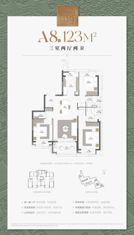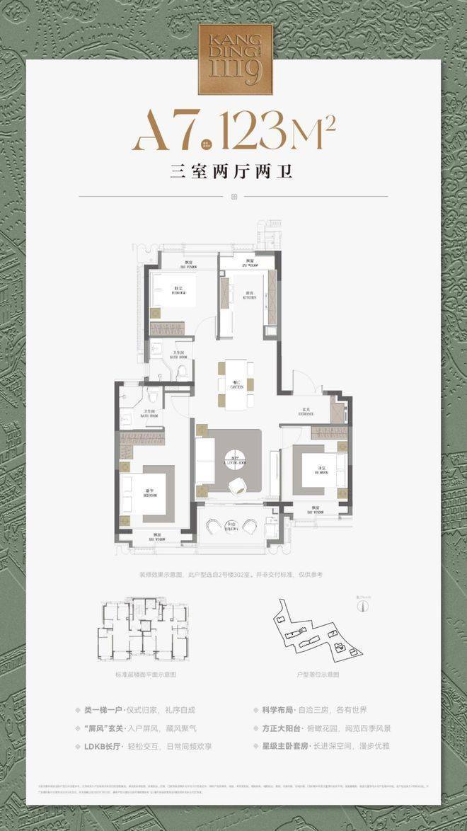 建筑面积约123㎡三房户型,飞机式布局,一镜到底的LDKB长厅,尽显隐贵静安风范;