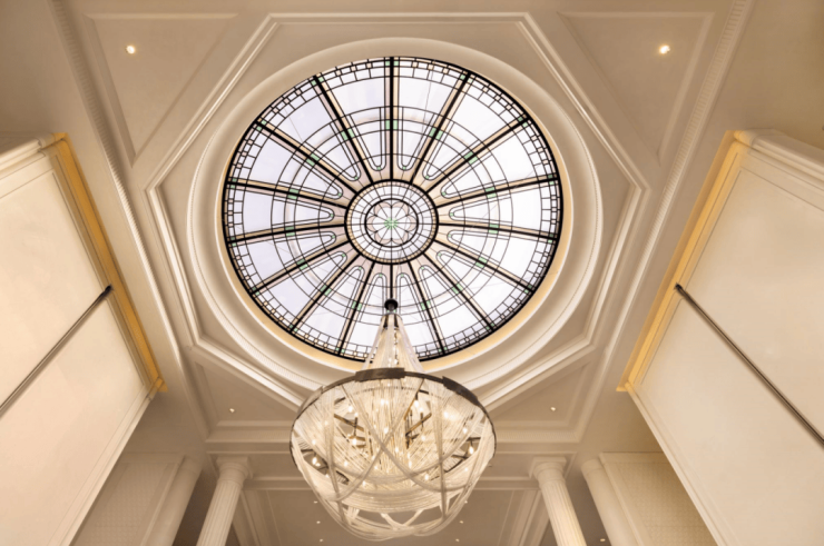 中庭设计的美琪穹顶亦是结合了美琪大戏院与和平饭店海派经典做法,用了近979块玻璃设计,将对品质的苛求运用在建筑的细节中,甚至二楼装饰的水晶灯,都选用高规格的E9级进口水晶制作,足以看出其匠心。