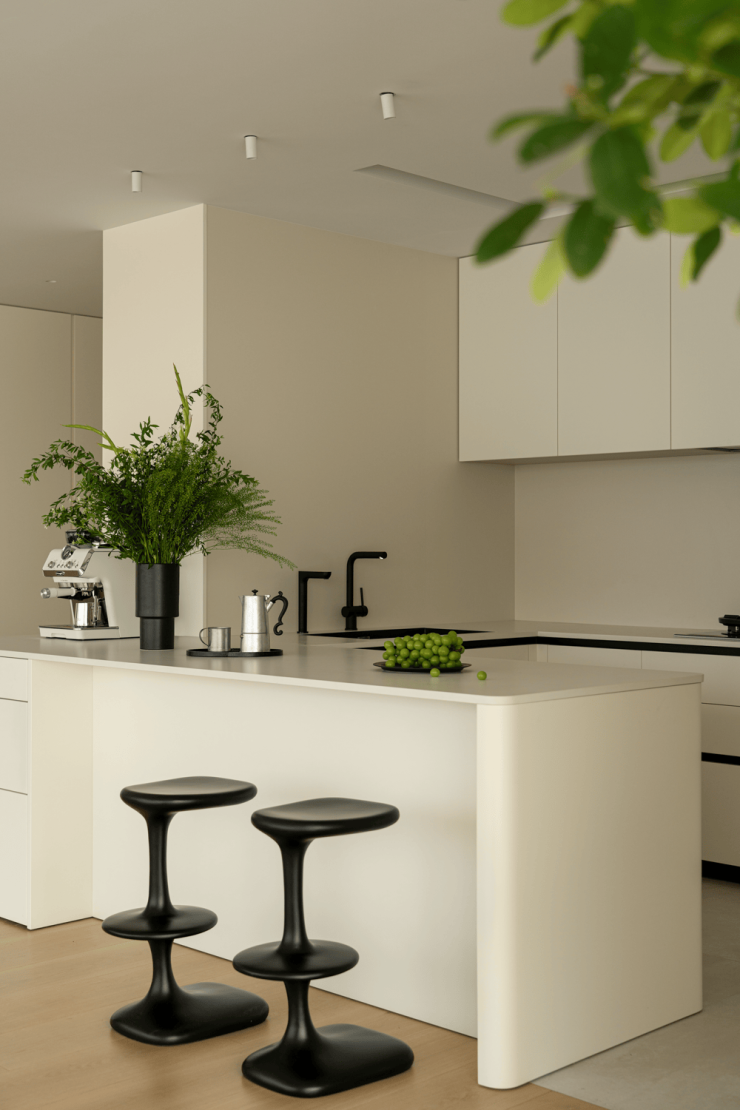作为入户第一幕,玄关以极简姿态开启生活叙事,素净墙面如天然画布。清透支架托举着素白花瓶,植物姿态俏皮延展,成为连接户外与生活的温柔过渡。
