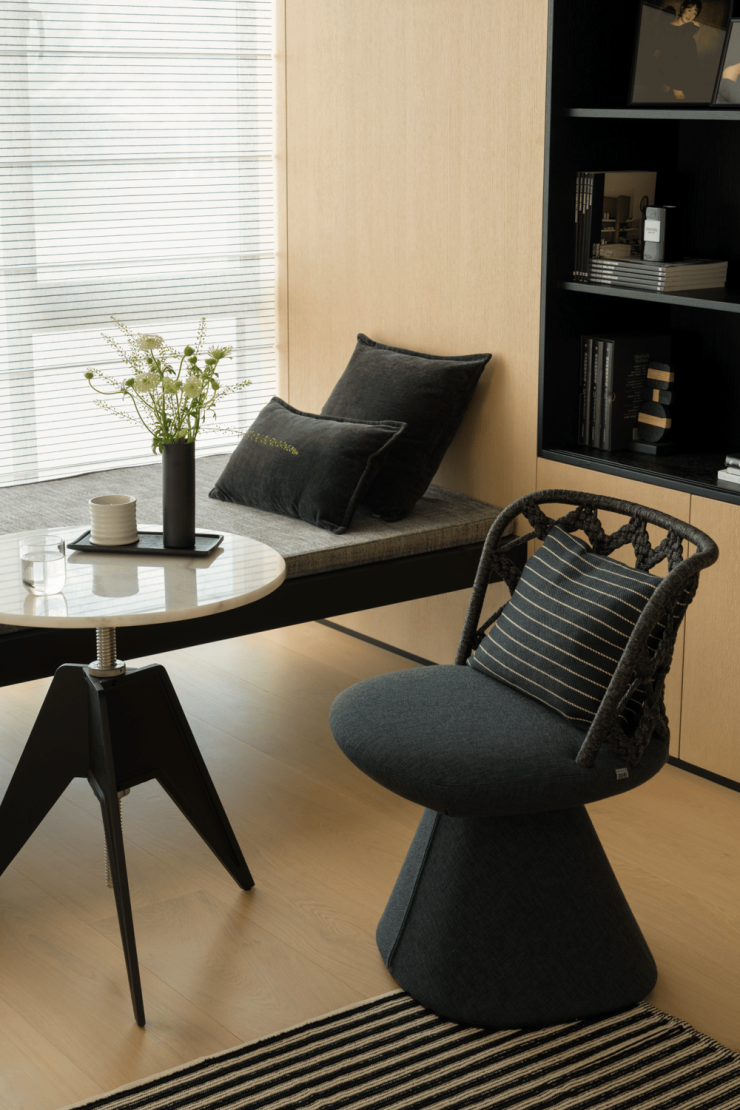 全开放式设计,岛形沙发打破边界,让交流随光影自由发生。午后的光线从侧面洒落,家具被赋予立体的光影层次。