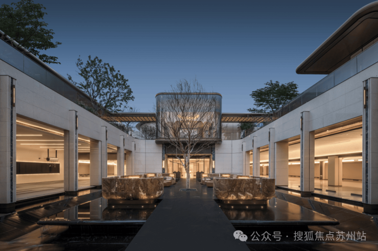门庭外,两侧辅以具有仪式感的跳泉水景,将建筑的圆弧美感与自然水景相合,共同构成海上·清和玺“贵雅清和”的城市界面。