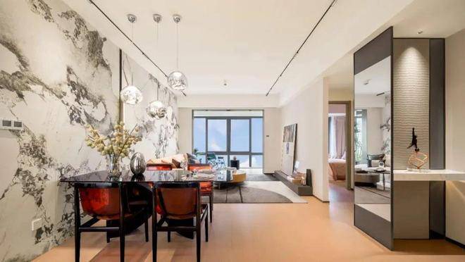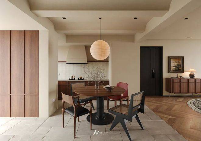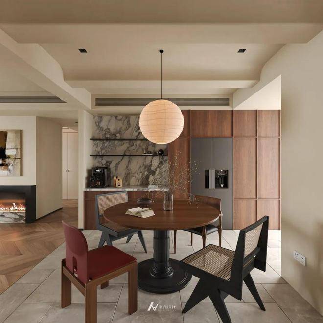 客厅、餐厅、餐厨区流畅贯通。客厅以壁炉营造温馨氛围,餐厅借圆形餐桌与球形吊灯构建聚合场景,二者通过顶面线条、地面材质(客厅人字拼地板/餐厅规整地砖 )自然过渡。餐厨区嵌入木质柜体与大理石背景墙,收纳与美观兼顾,各功能区既相对独立,又因开放格局深度融合,打造出互动性强、通透开阔的现代家居生活场景 ,让空间在视觉与使用体验上都更具延展性。